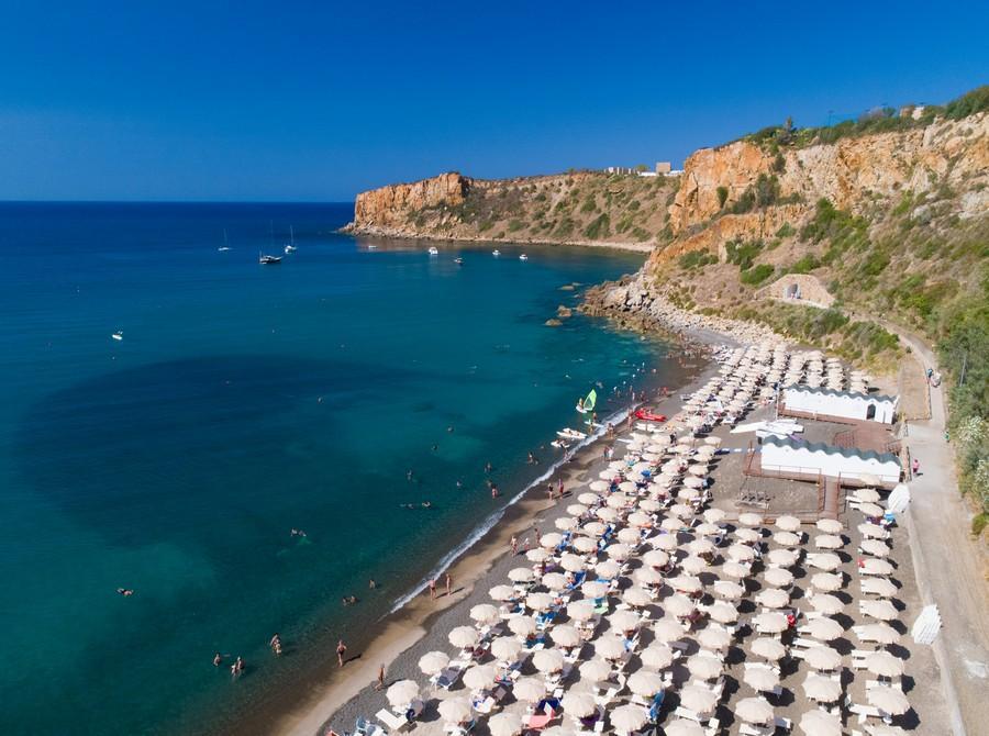 Una bella e lunga spiaggia di sabbia vulcanica nera si trova ai piedi del promontorio, ed è accessibile grazie agli ascensori ricavati nella roccia. L’area privata, è attrezzata con lettini ed ombrelloni, base nautica, bar e servizio di sorveglianza.